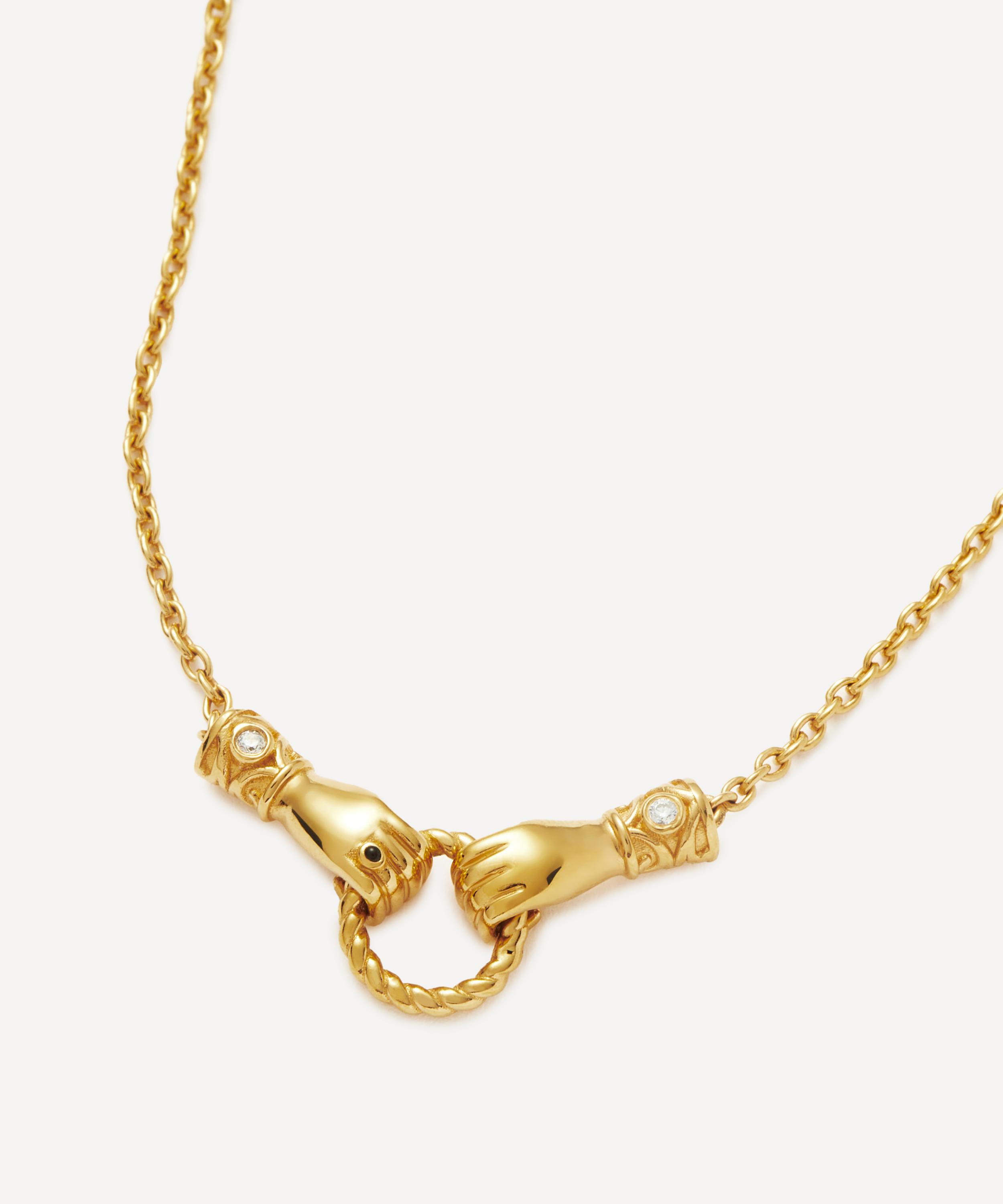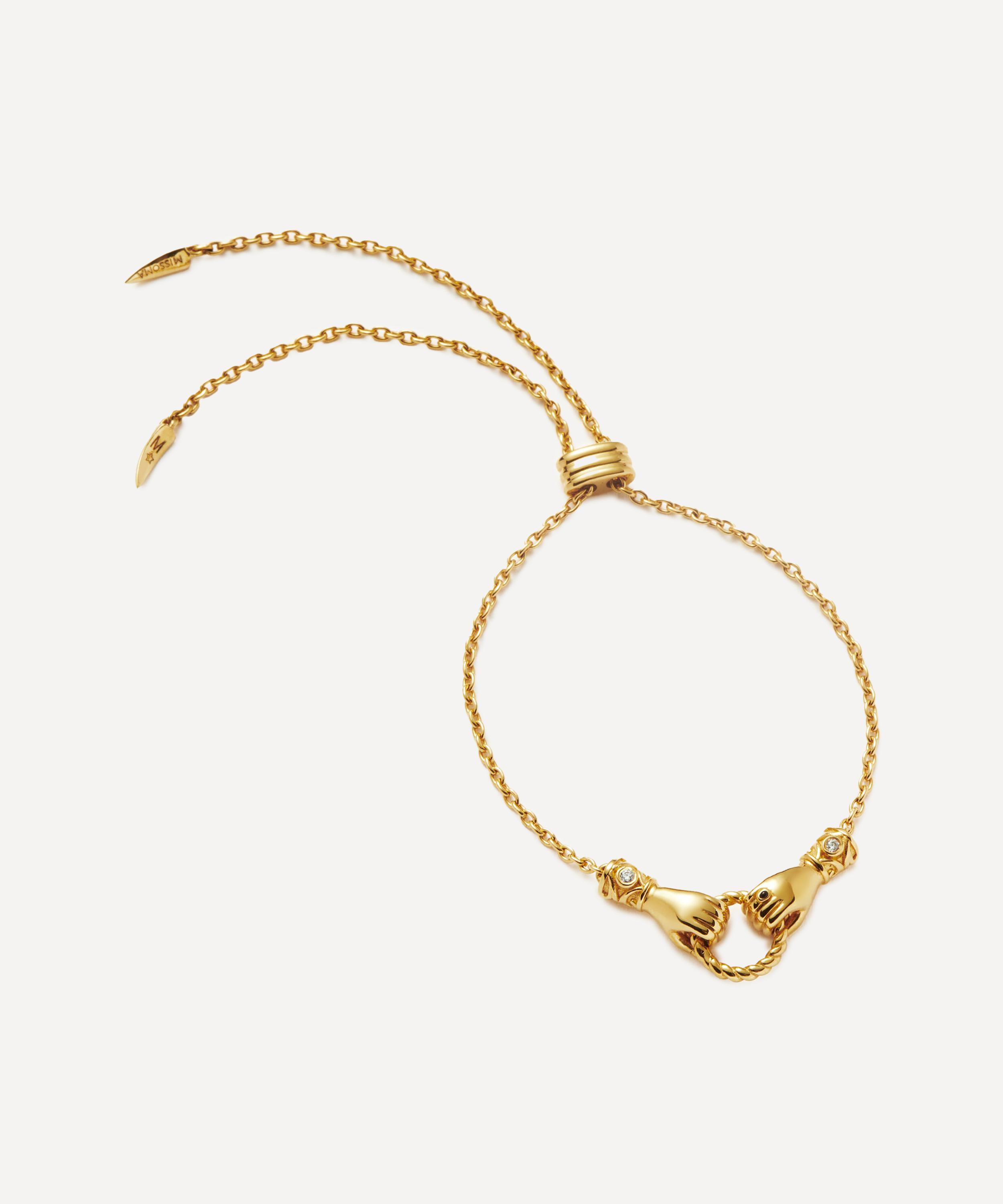 Curate your own bespoke stack with this bracelet from the Harris Reed x Missoma collection. Crafted from gold-plated brass, it features a fine cable chain and two Georgian-style hands, inspired by the collections popular ‘In Good Hands’ design, holding a twisted ring. Each cuff has been embellished with a white cubic zirconia and one hand features a black enamel ring. Wear it solo, or team with an assortment of bracelets or matching pieces from the collection.