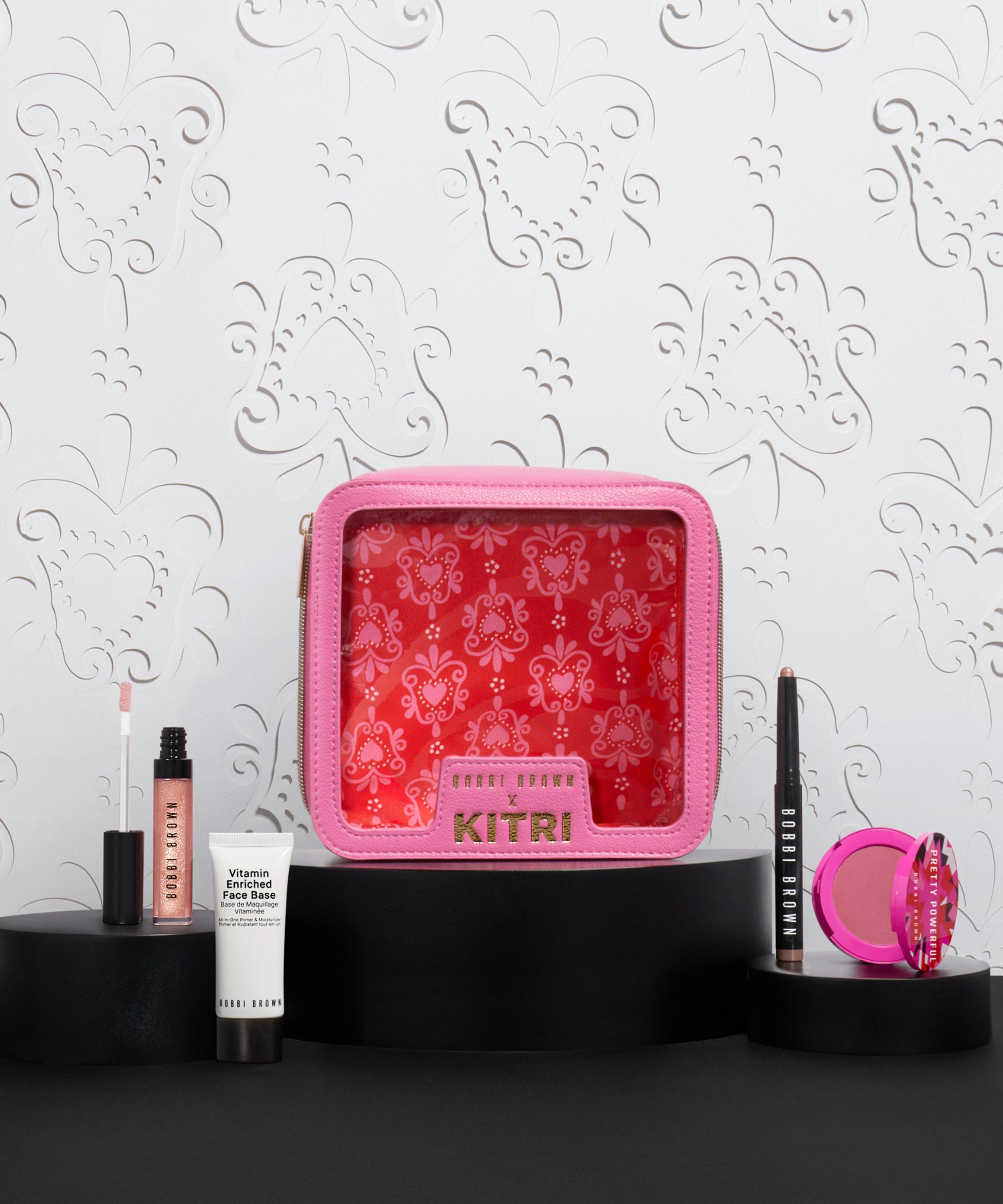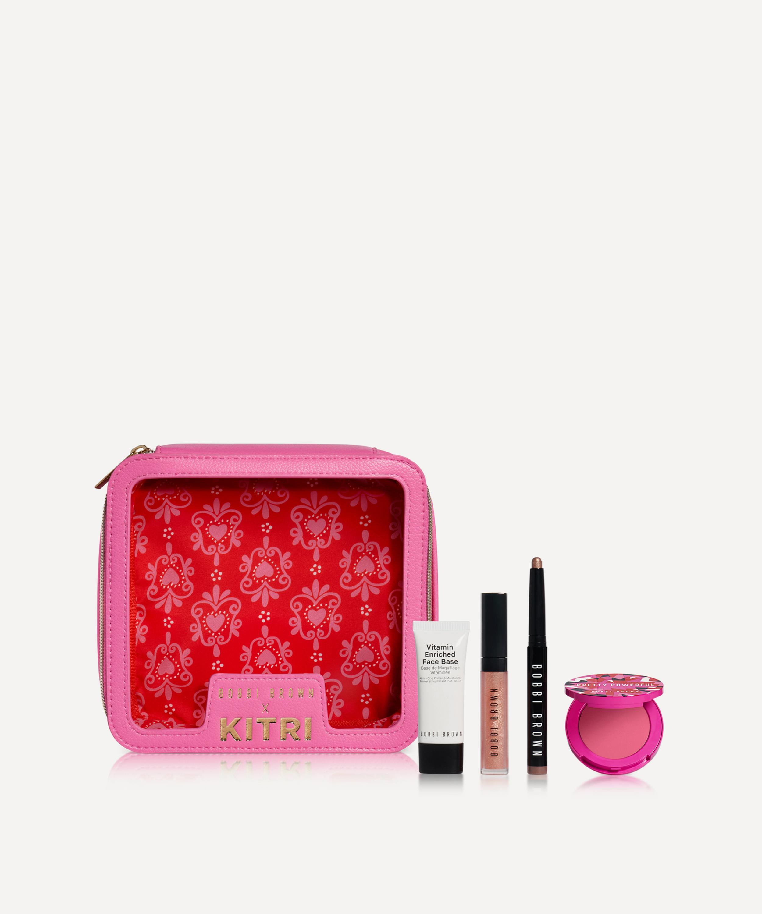 • Housed in a faux leather makeup case with gold-tone branding on the front and lined with KITRI’s Pink Hearts print