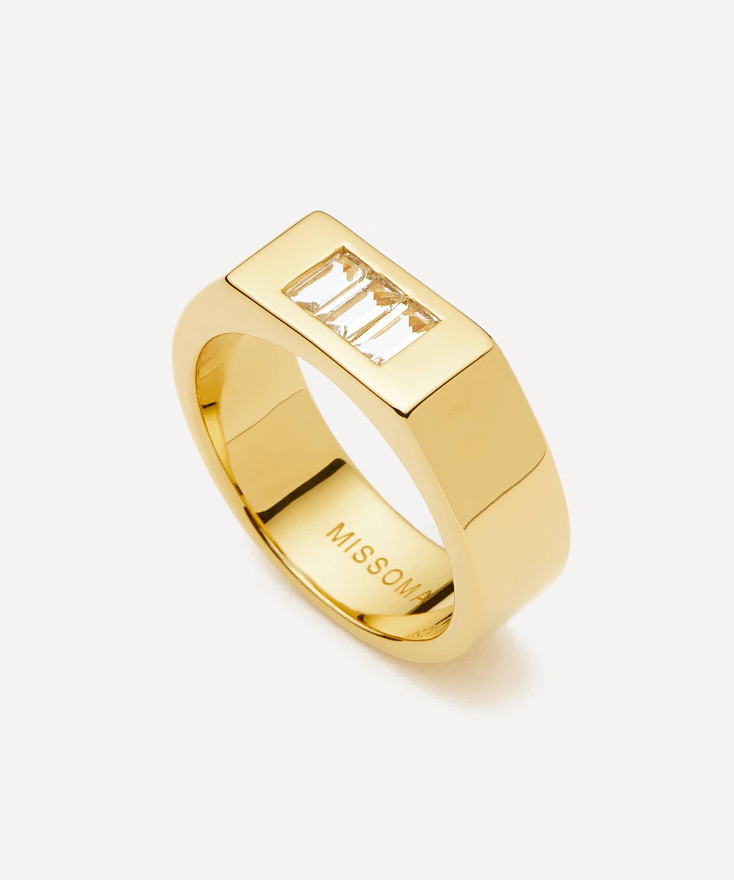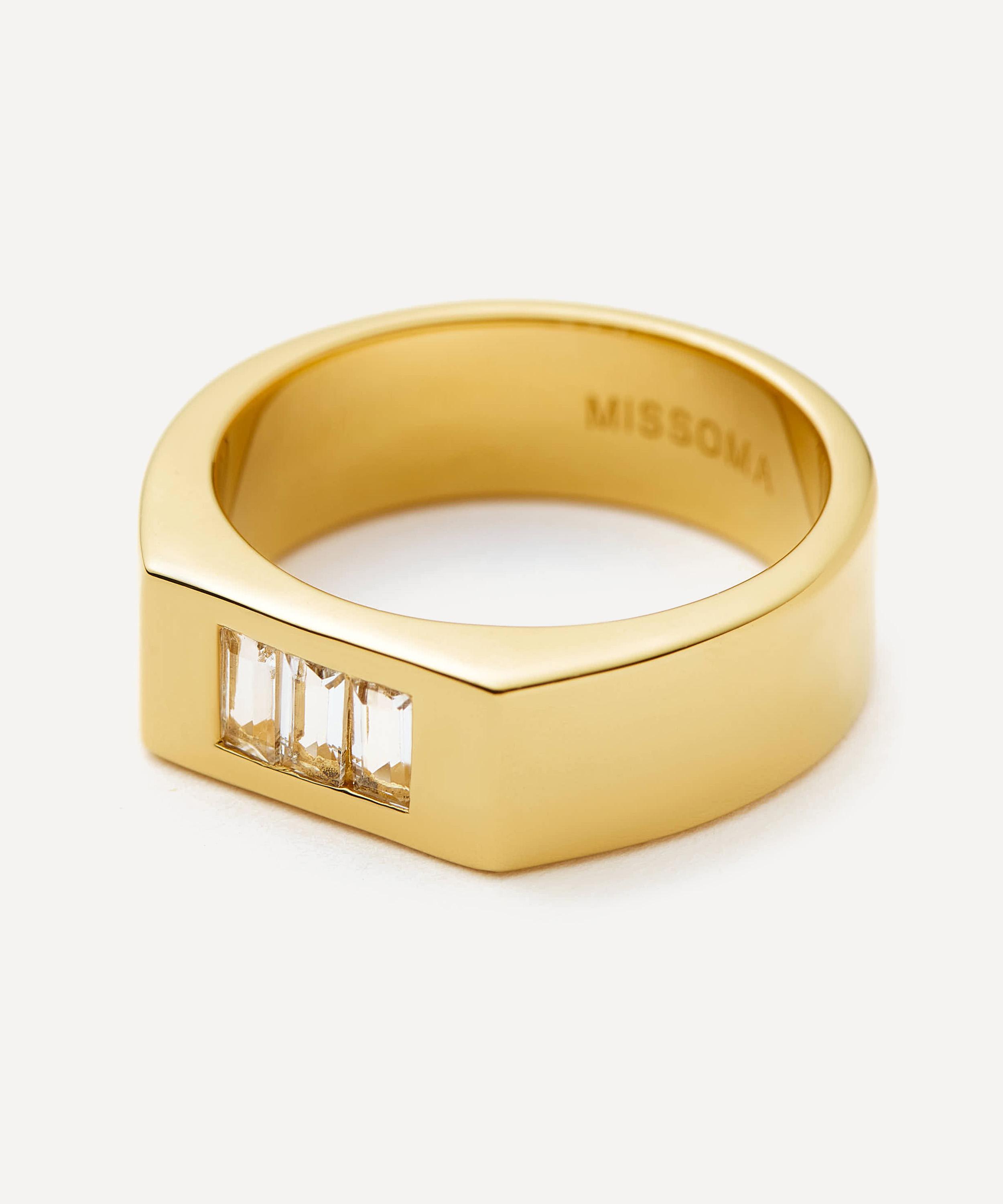 Make a statement and elevate your outfit with the standout Triple Stone Chunky Ring from Missoma, in collaboration with Lucy Williams. Crafted from 18ct gold-plated silver, it features a chunky silhouette, adorned with three baguette cut cubic zirconia stones. Perfect for every day and special occasions, style yours solo or stacked, and try pairing it with other iconic Lucy Williams styles.