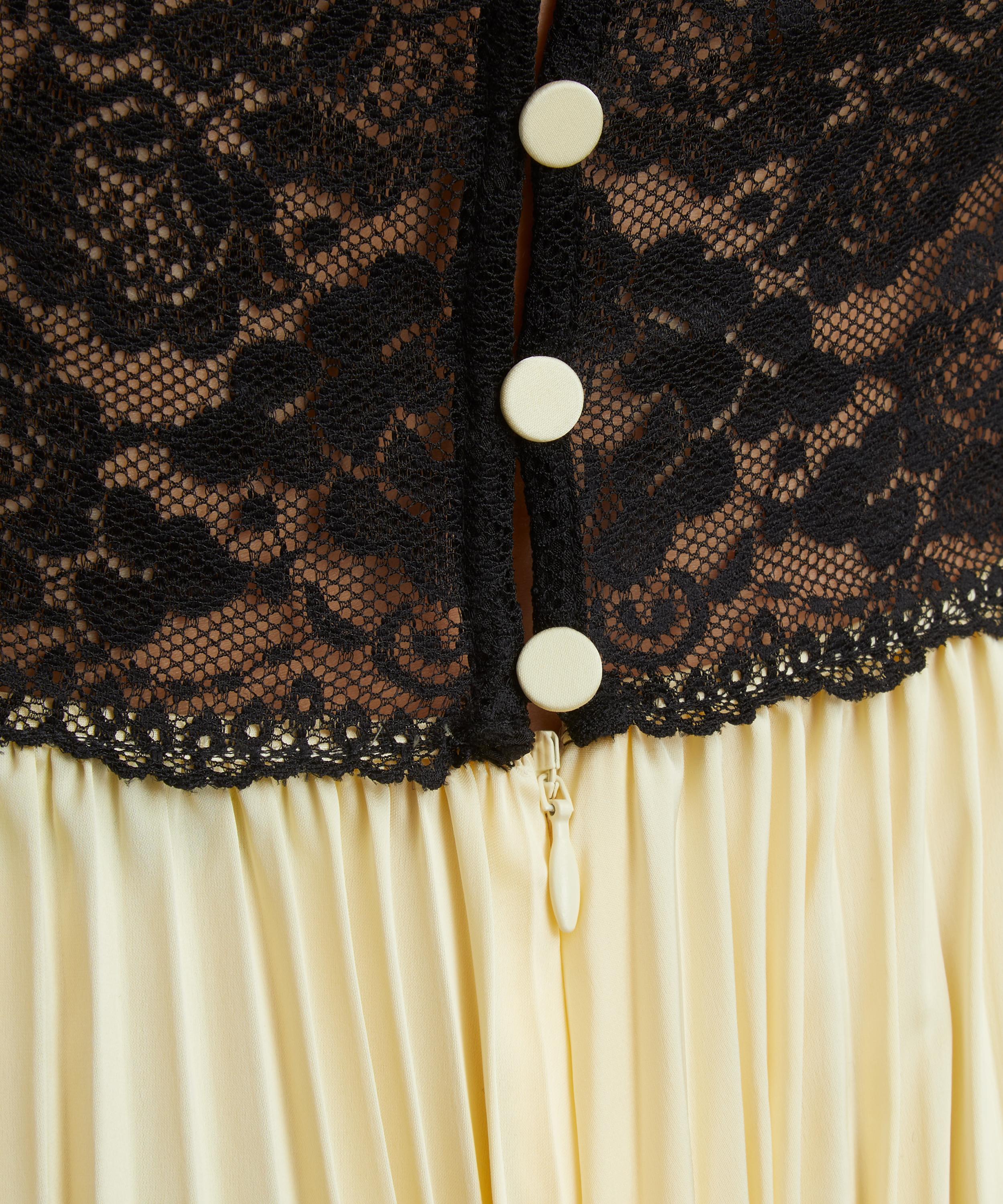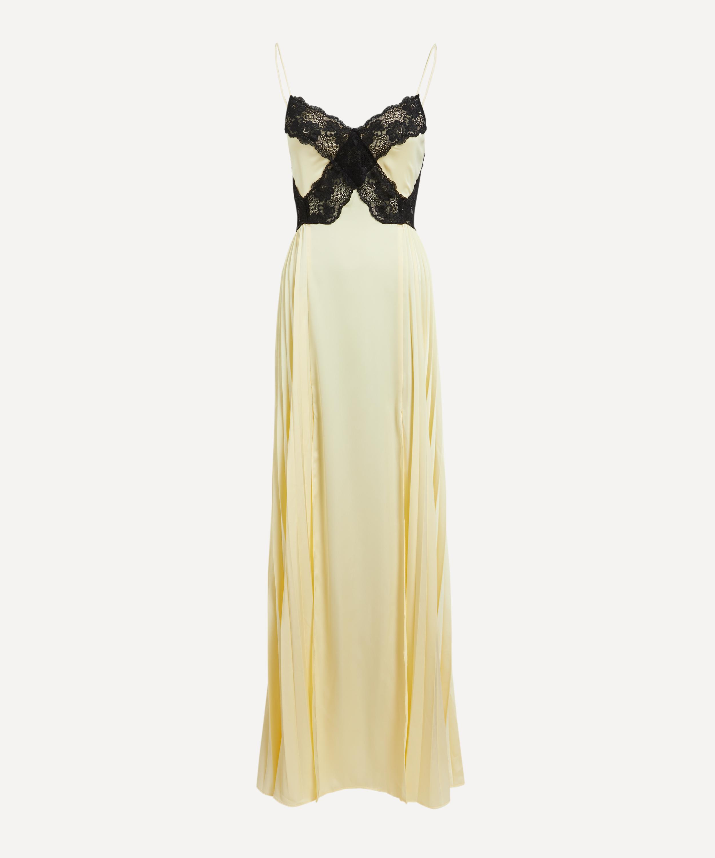 With its flattering yellow satin construction, lace detailing and spaghetti straps, this ethereal dress exudes feminine elegance. Pleating to the waist adds a romantic touch, making it the perfect choice for a special occasion or an unforgettable event.Composition & Care