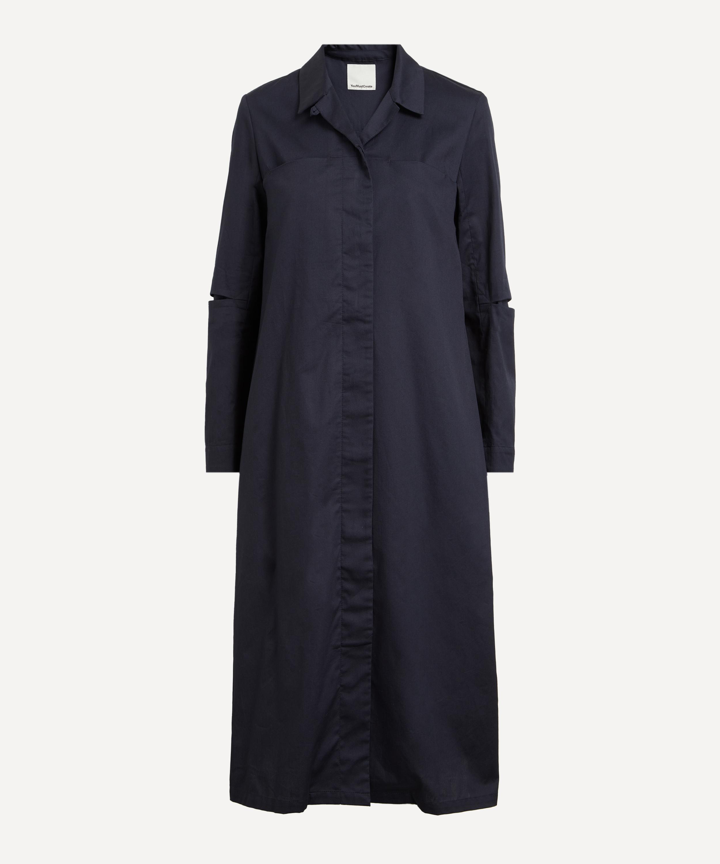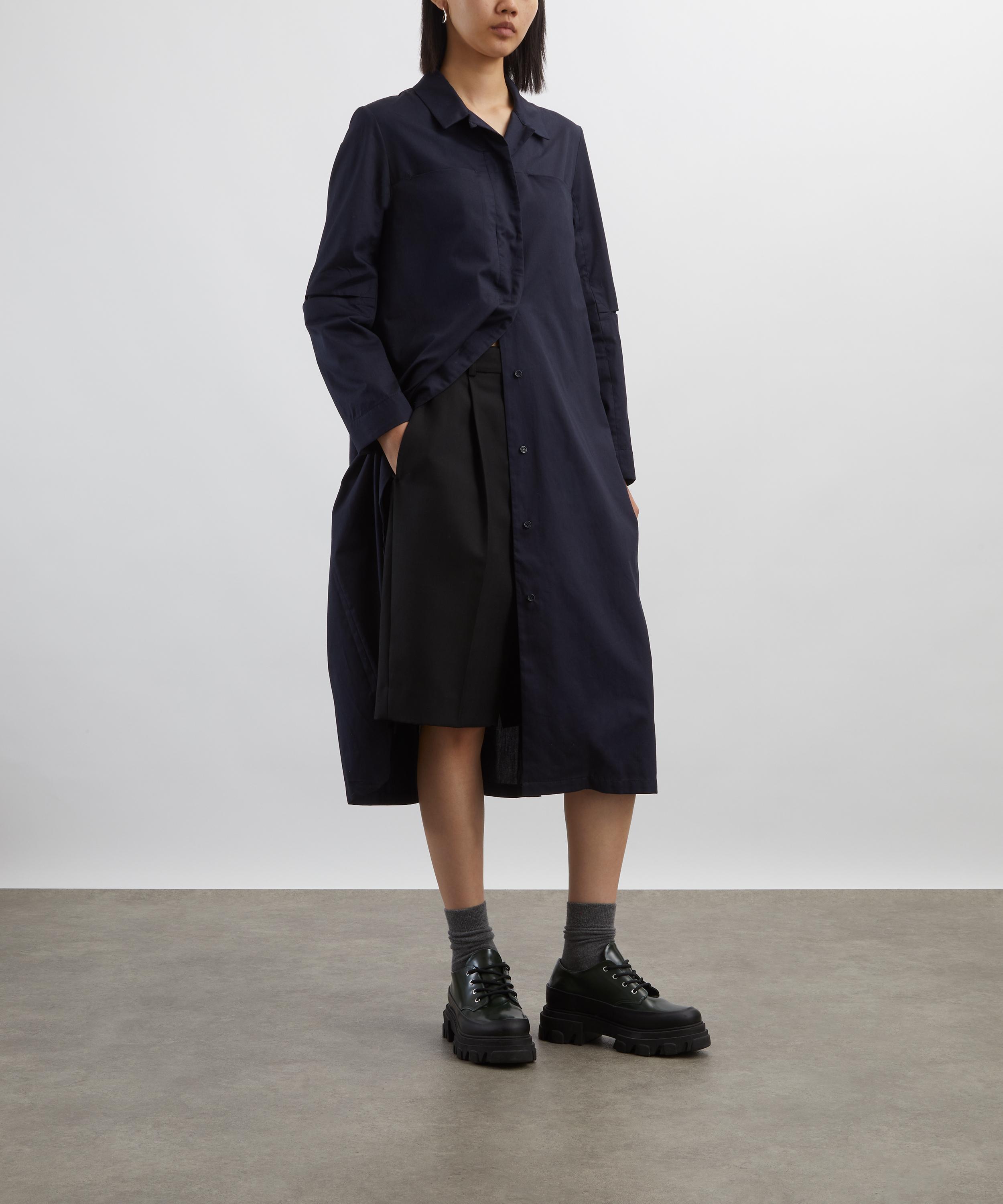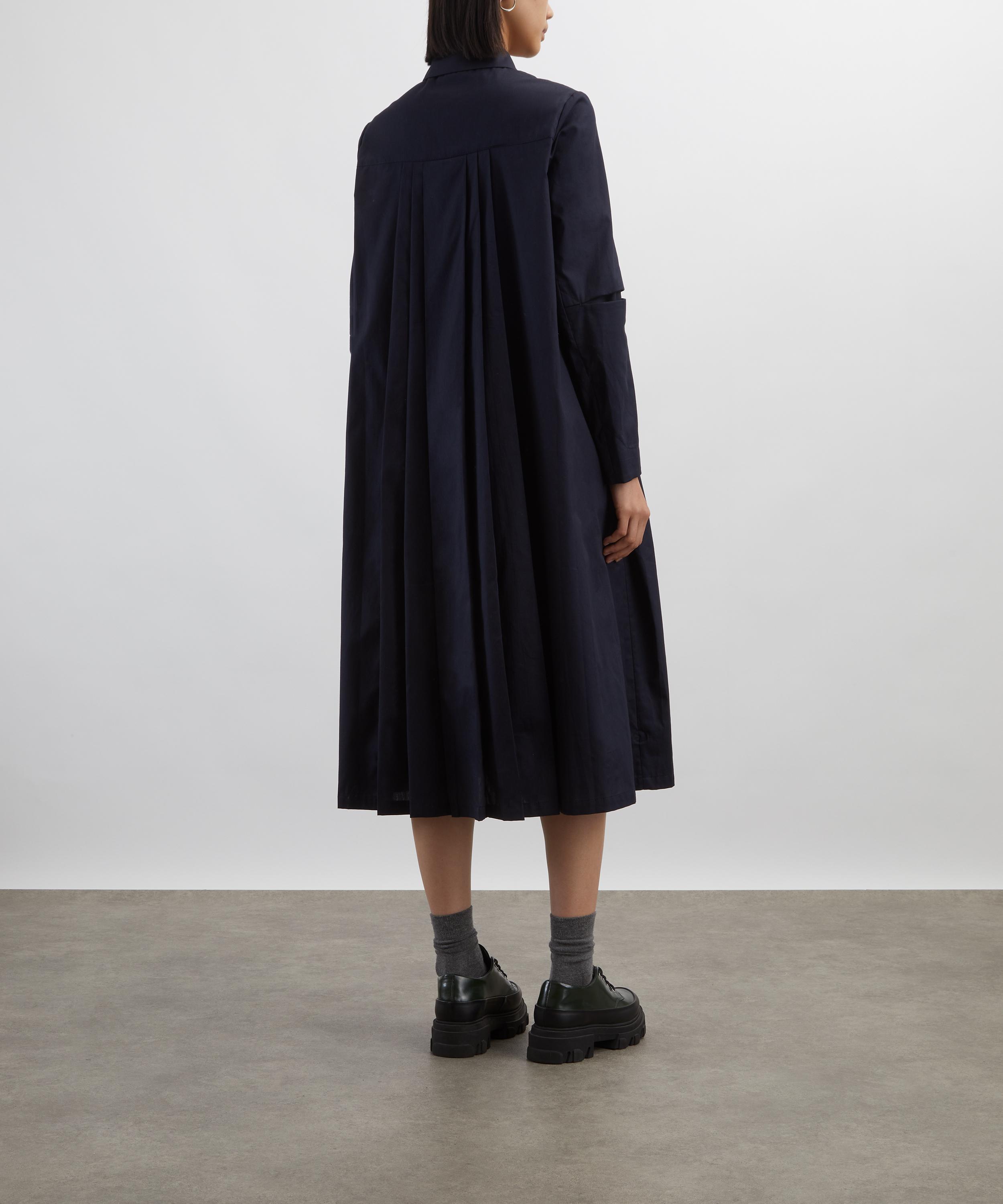 Crafted from midweight washed cotton, this navy shirt dress features a relaxed silhouette that falls to a loose midi length. A concealed front button closure keeps the look minimal, while pleating at the front and back enhances its voluminous shape.