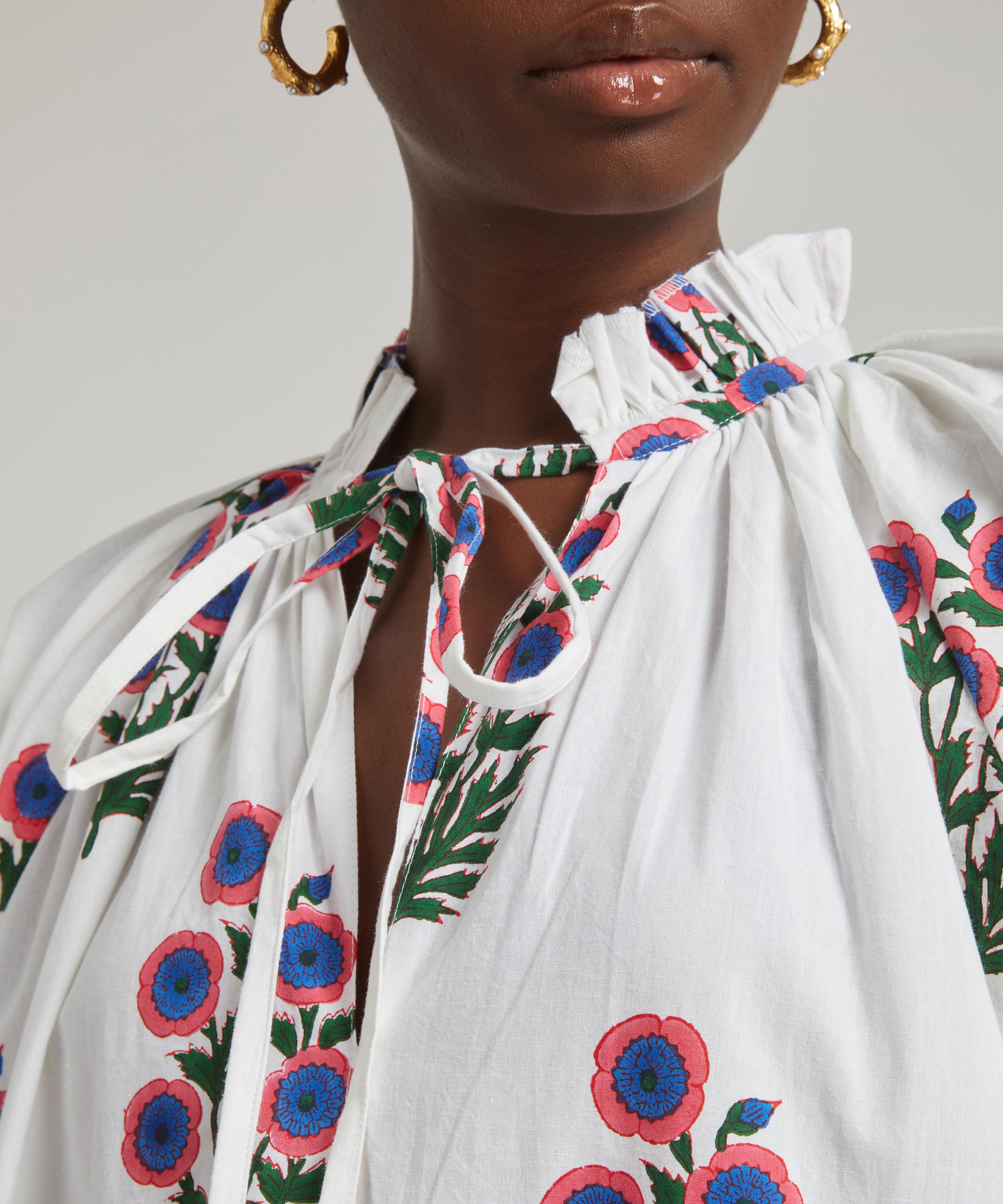 Bold in print and brimming with colour, the Yuva dress is crafted from pure Indian cotton and cut to a billowing, tunic-style with a natural waistline that falls to a voluminous ankle-length hem. Adorned all over in a pretty, pink poppies print with a contrasting paisley-print trim across its cuffs and hem, this effortlessly feminine dress is complete with a delicately ruffled round-neckline and breezy, elbow-length sleeves. Simply style with blue-checked mules for a summer-infused look all year round.