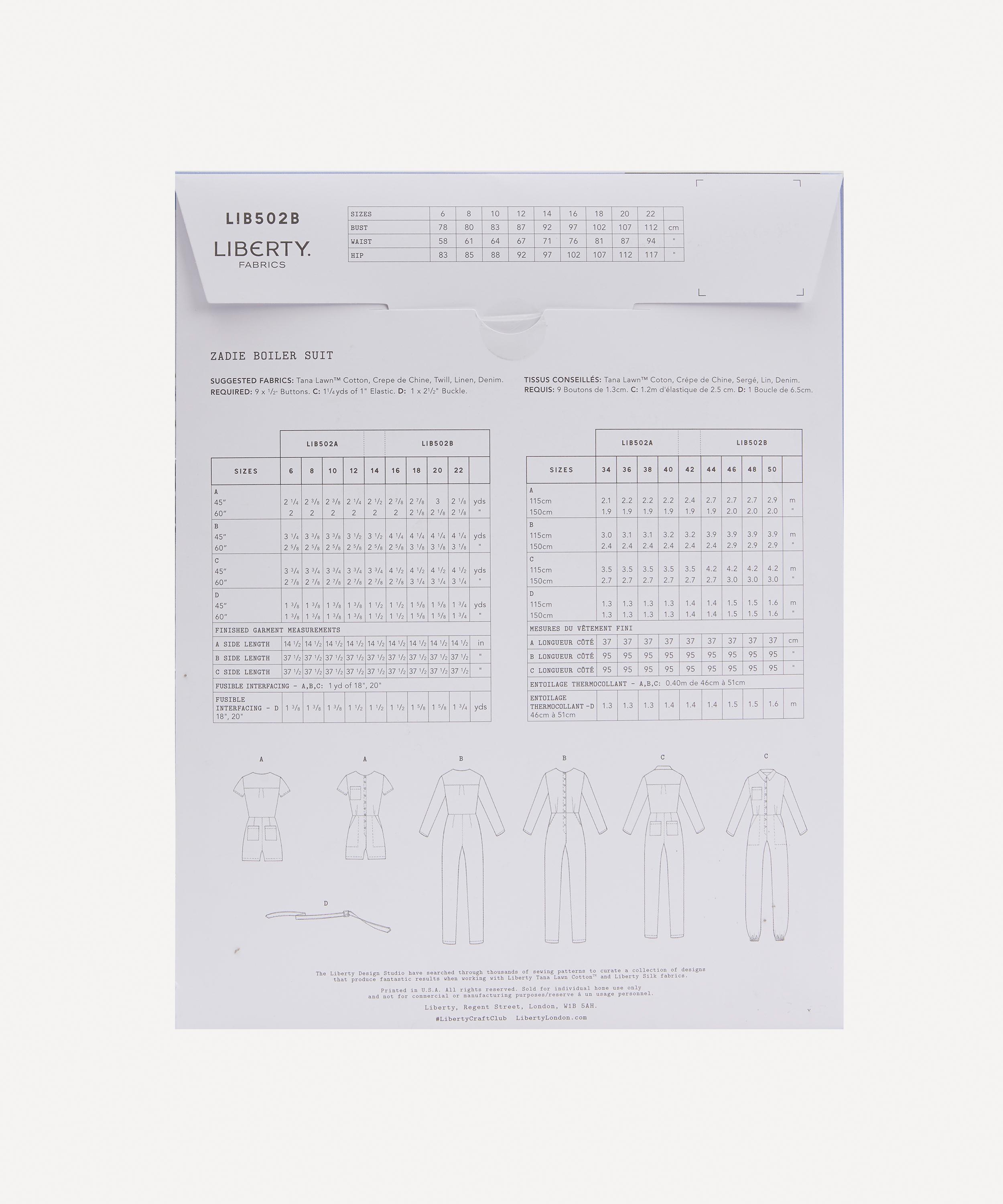 The new Liberty Fabrics dressmaking patterns draw inspiration from our richly storied fashion archive, with contemporary style details offering a fresh twist on classic vintage shapes. A versatile silhouette, the Zadie boiler suit can be constructed as full-length suit or as a short playsuit. Make this Liberty pattern with textural crepe de chine, denim or our signature Tana Lawn™ cotton, in sizes 14-22.