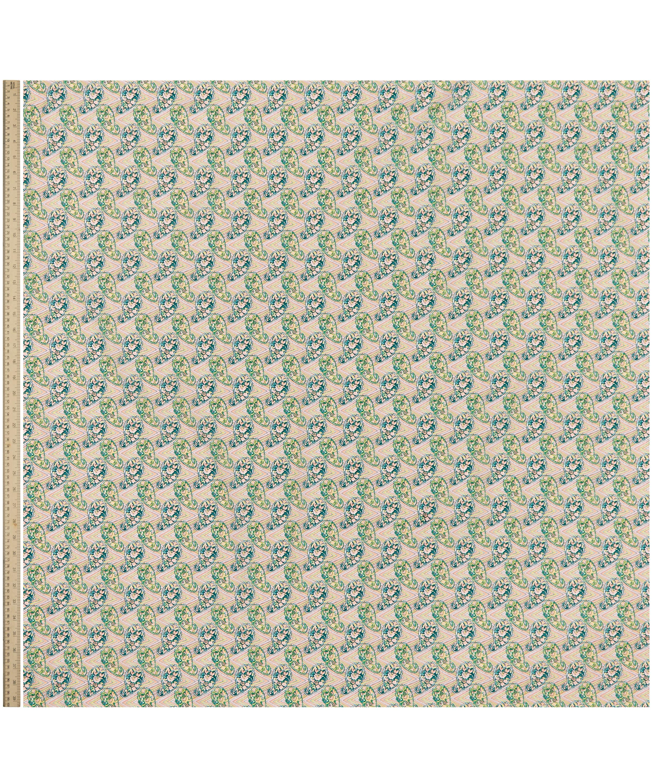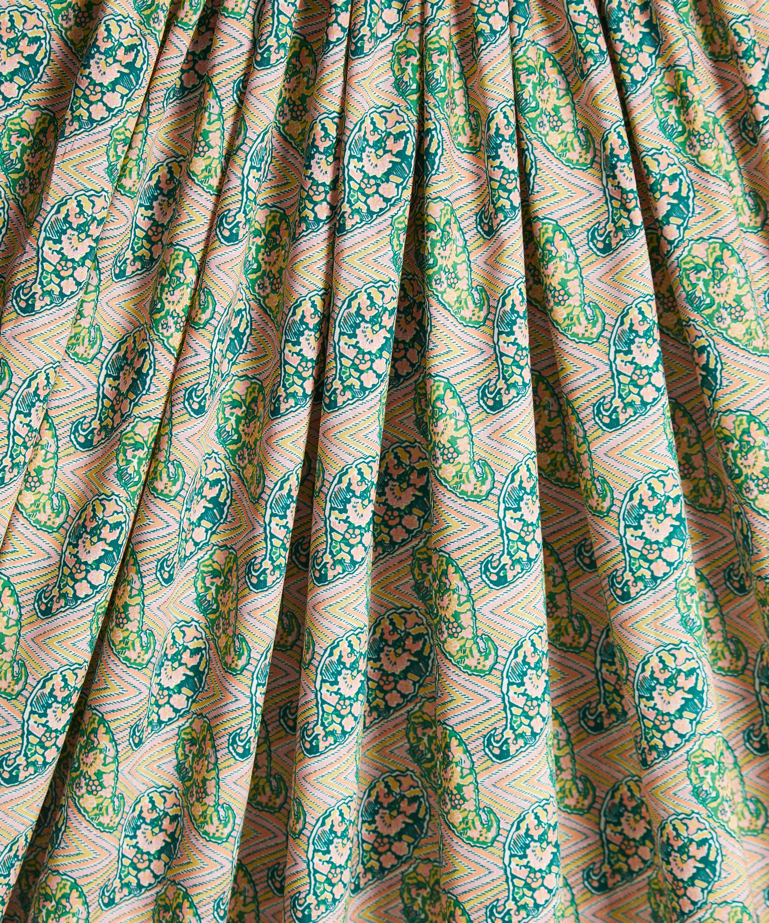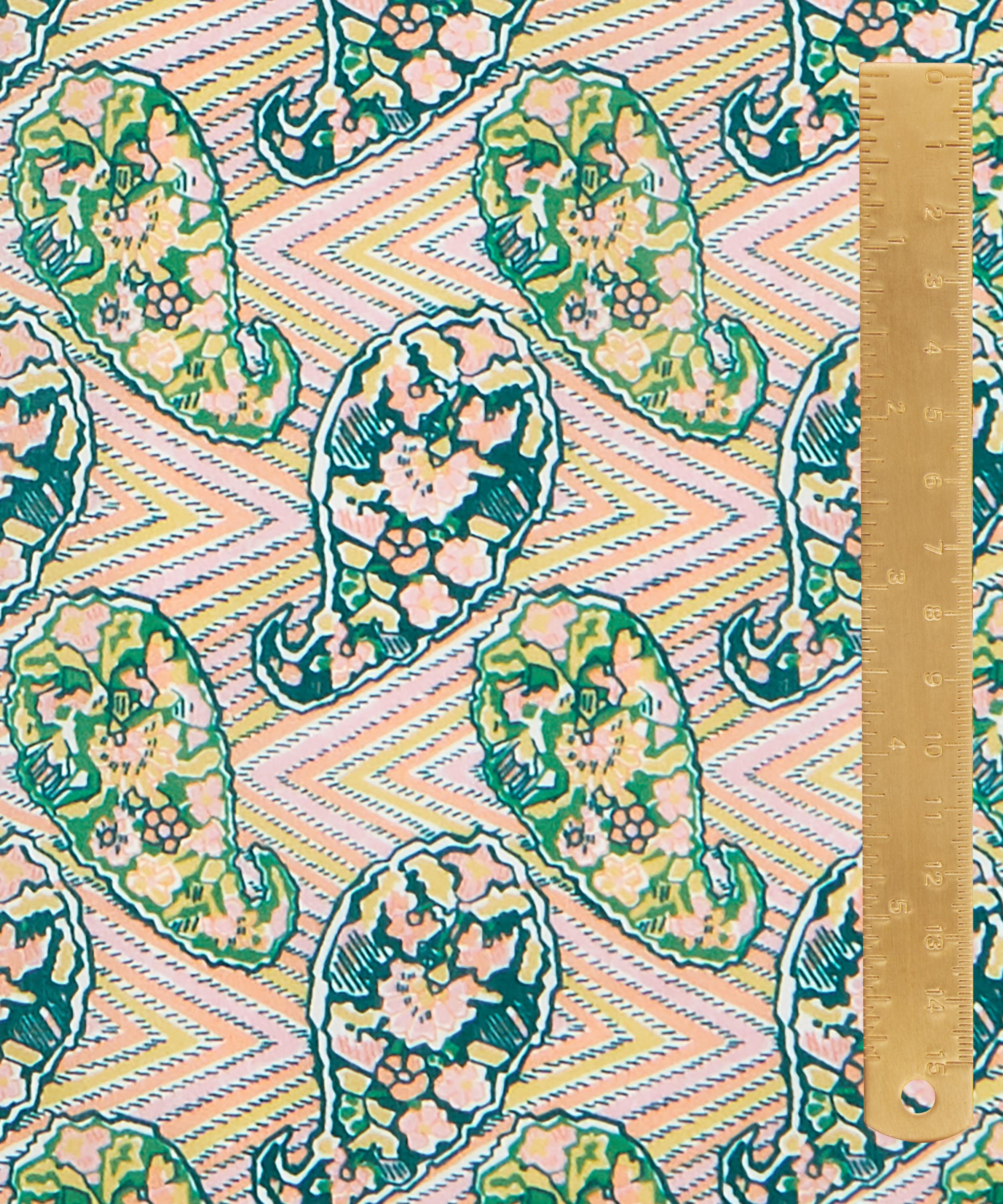 Originally discovered in a pattern book dating from 1921, this mesmerising print features a unique juxtaposition of traditional paisley motifs combined with a contemporary geometric chevron ground.