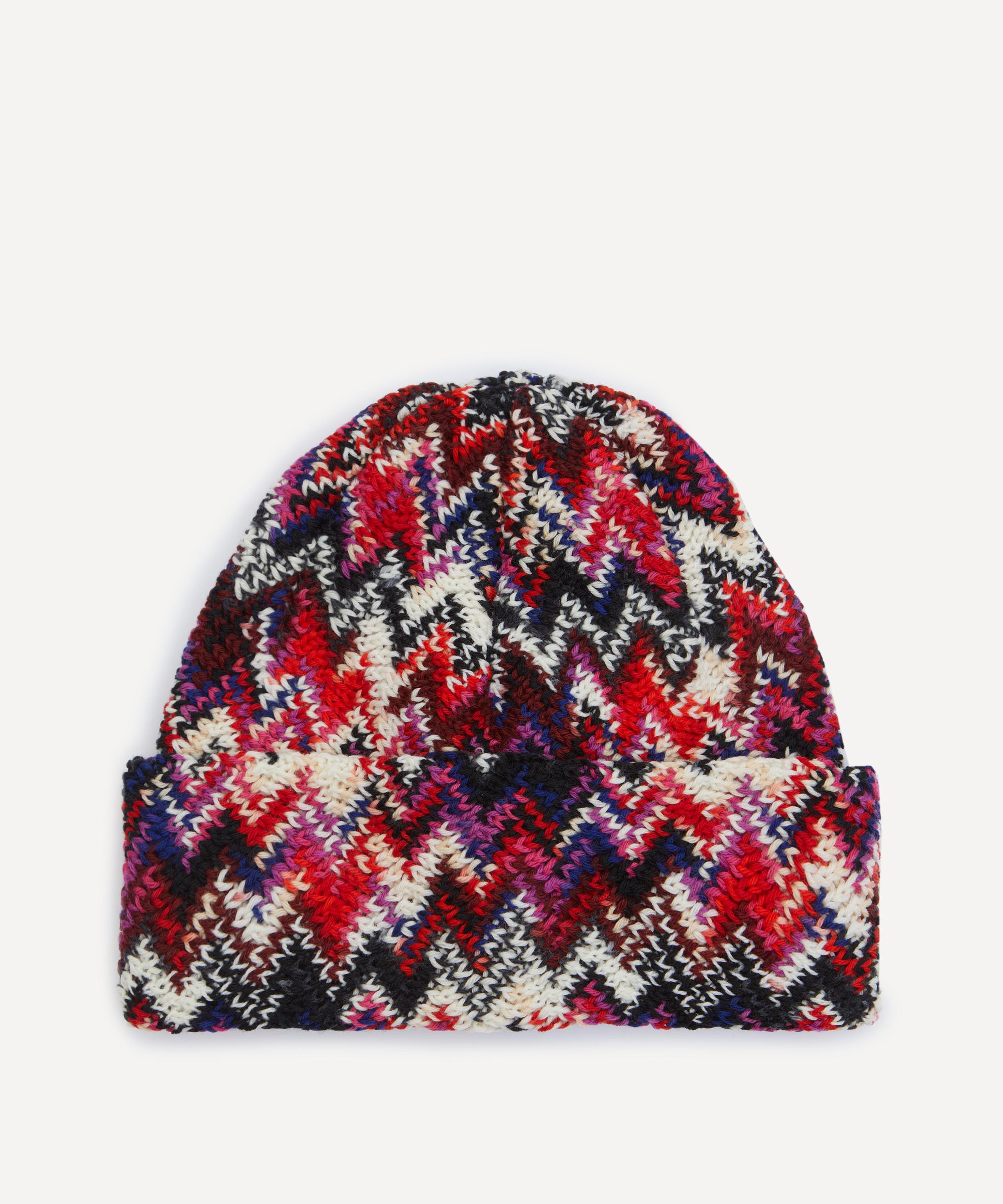 Infusing your winter wardrobe with a burst of iconic pattern, this beanie hat from Italian fashion house Missoni showcases the brand's distinctive knit. This staple piece is crafted from a warming wool knit with an eye-catching zig-zag pattern in an elegant colour palette, enlivened with pops of pink and purple, and is complete with a turn-up cuff for a casual finish.