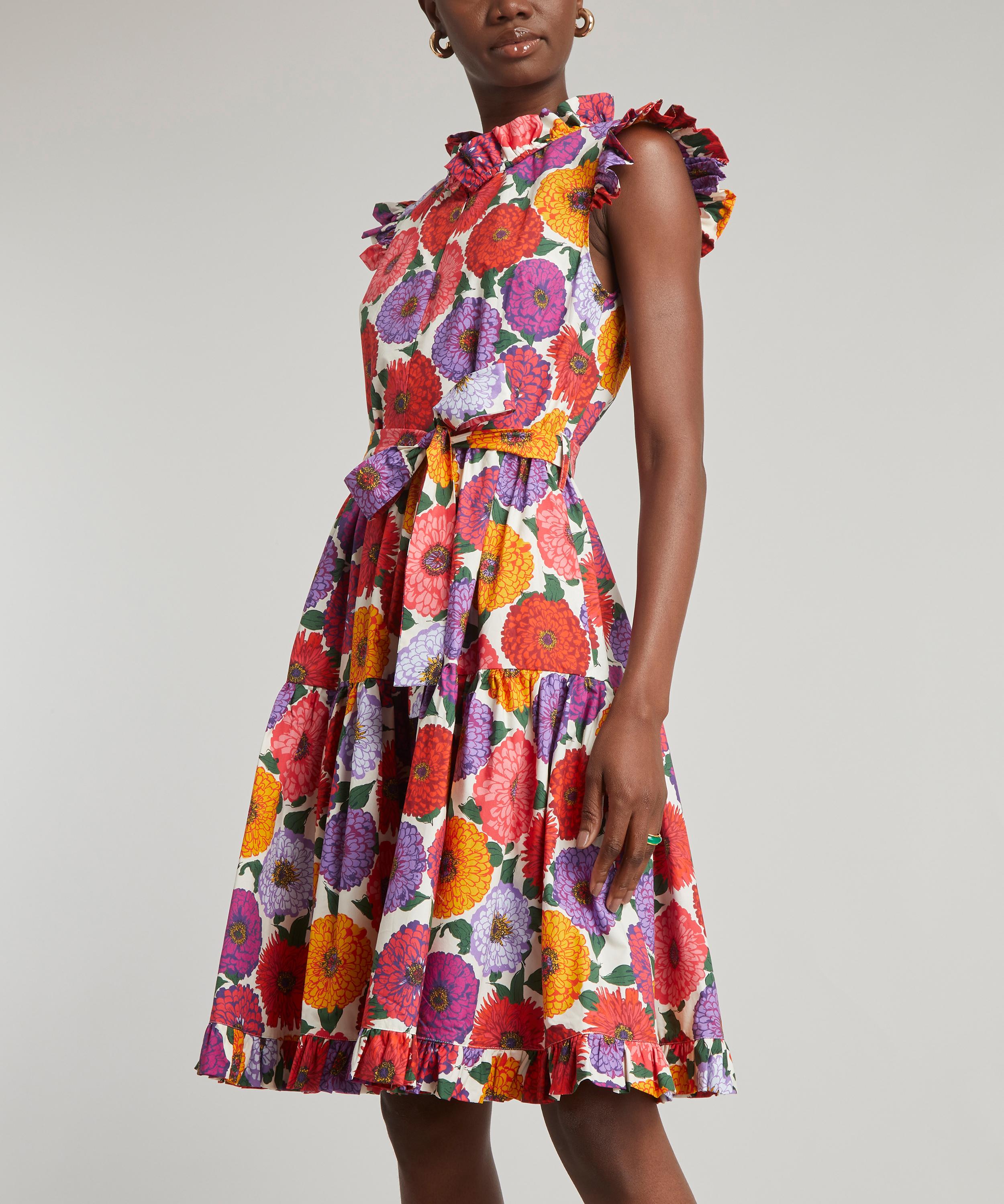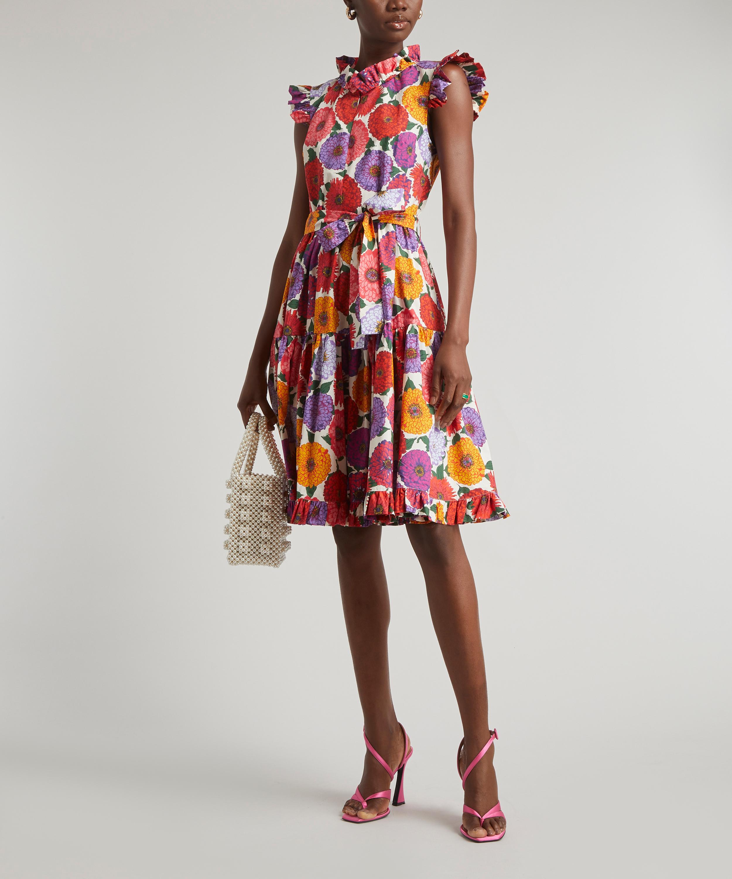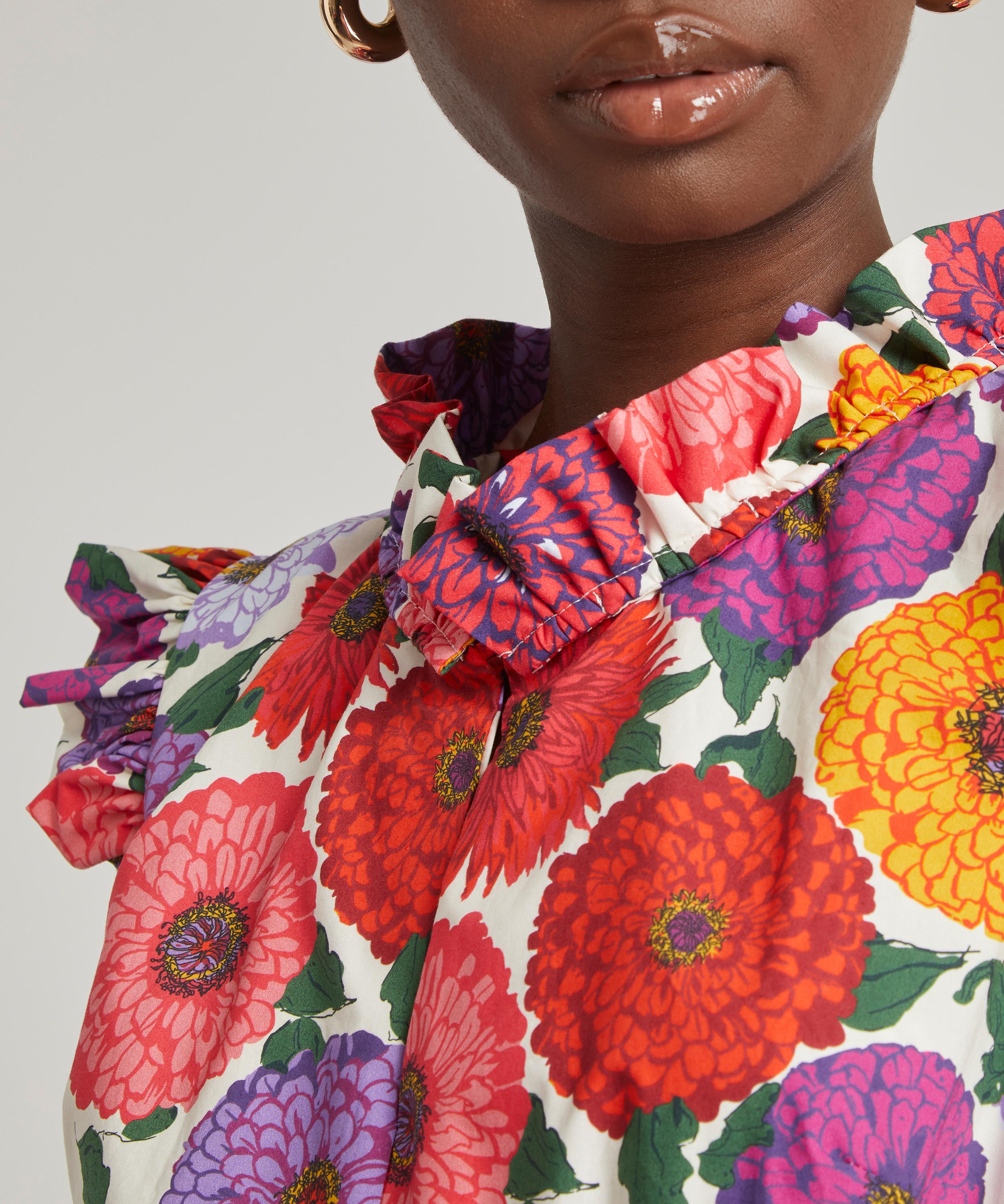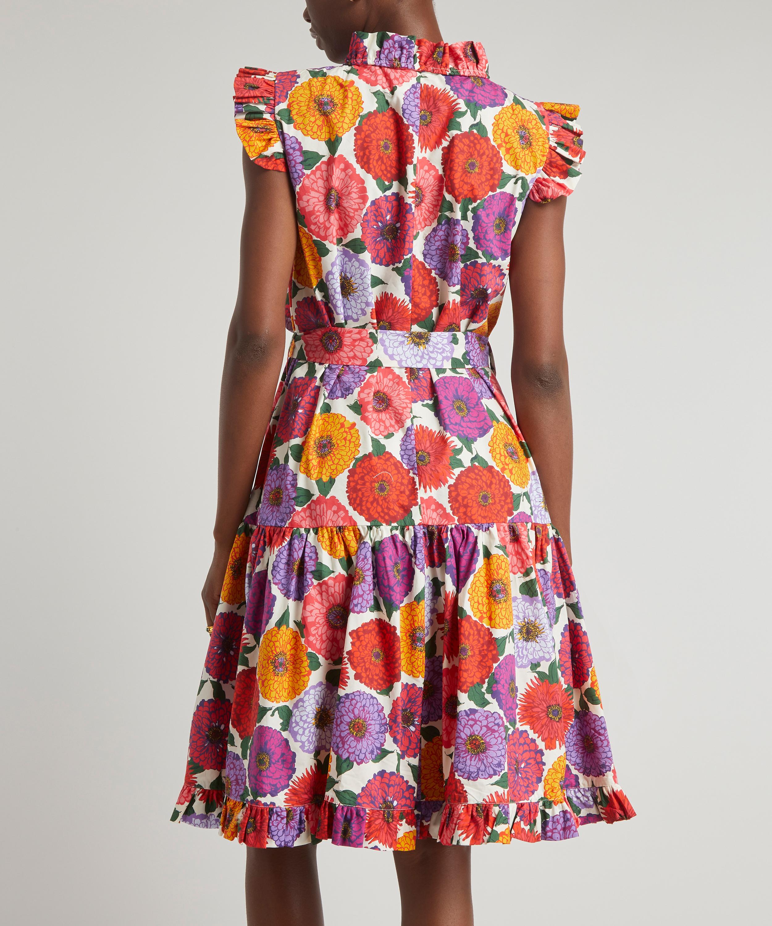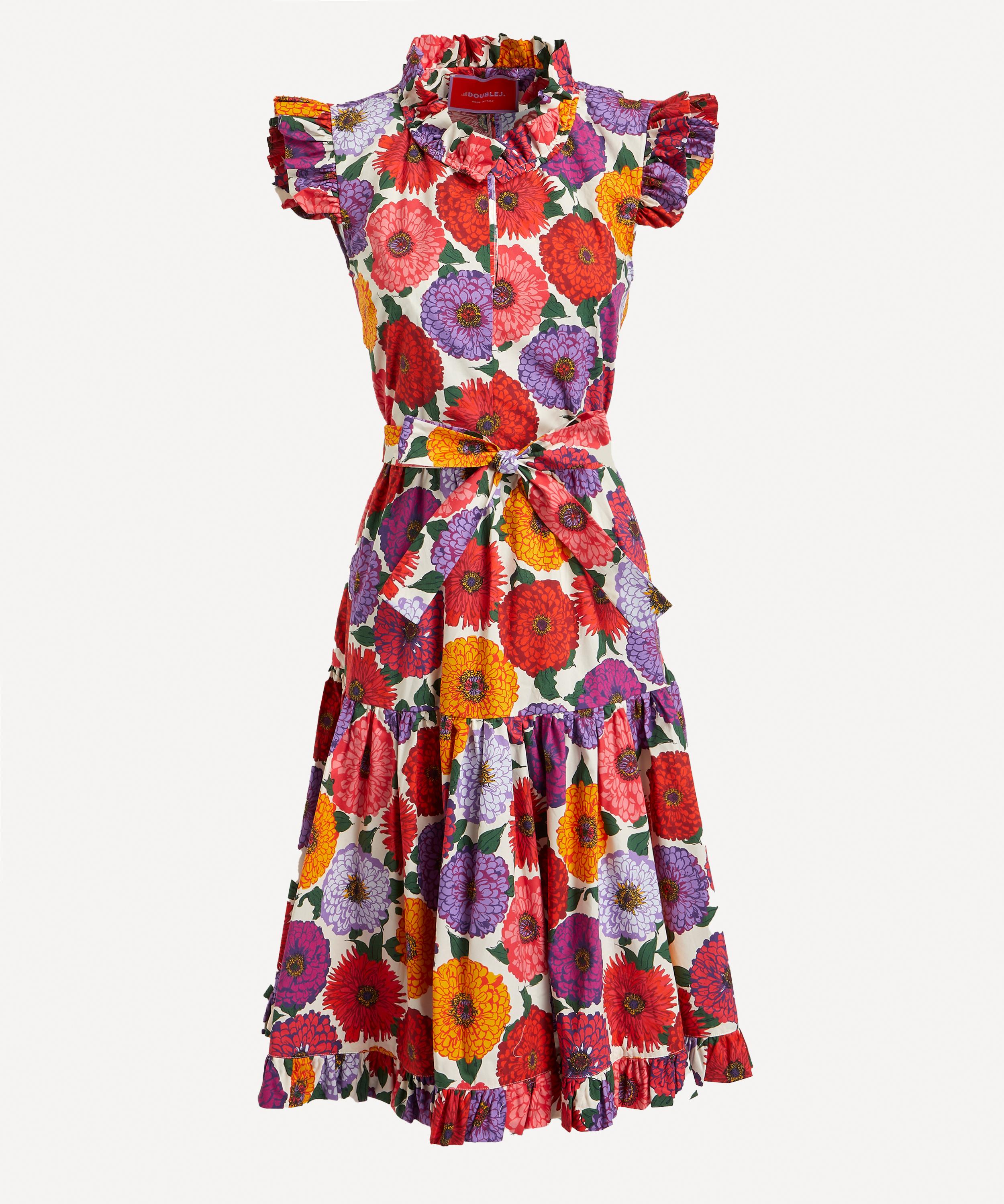 This beautifully bright, cotton poplin mini-dress perfectly demonstrates La DoubleJ’s appreciation for theatrical styles. The frilled details and dramatic, tiered skirt add a free-spirited decadence. Adorned all-over with the floral ‘Zinnie’ print for the new season, its graphic purple, pink and orange colourway is sure to catch the eye of everyone in the room – we suggest pairing with playfully clashing heels.